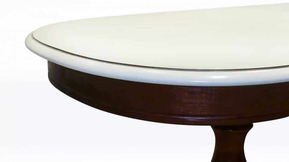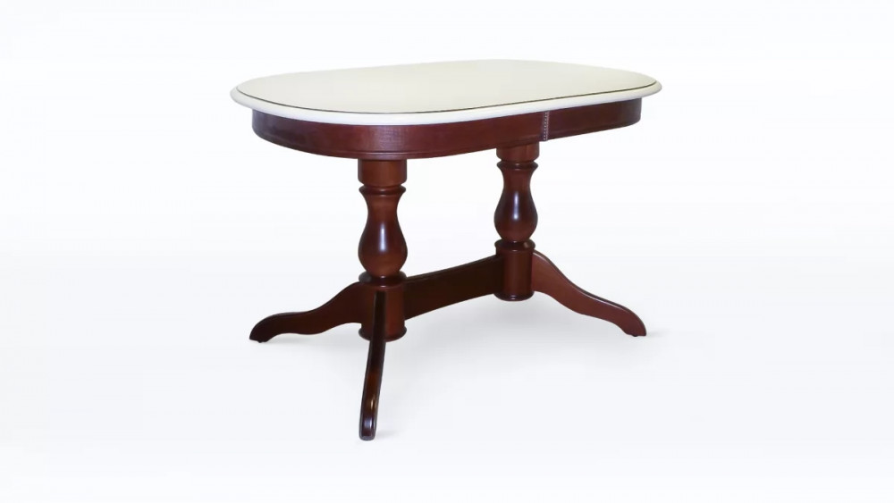 Овальная столешница, обитая шпоном дуба, в разложенном виде имеет оптимальный размер для комфортного расположения 4-6 человек. Но если вам требуется больше места, удобный синхронный механизм раскладки позволяет легким движением руки увеличить стол до полутора или двух метров в длину (в зависимости от модификации). Фигурные опоры с резной отделкой делают мебель максимально устойчивой. Стол изготовлен из натурального массива березы - прочного, долговечного и экологичного материала. При изготовлении на заказ от производителя вы сможете выбрать наиболее подходящий размер, тонировку и купить кухонный стол, который идеально подойдет для вашего дома.