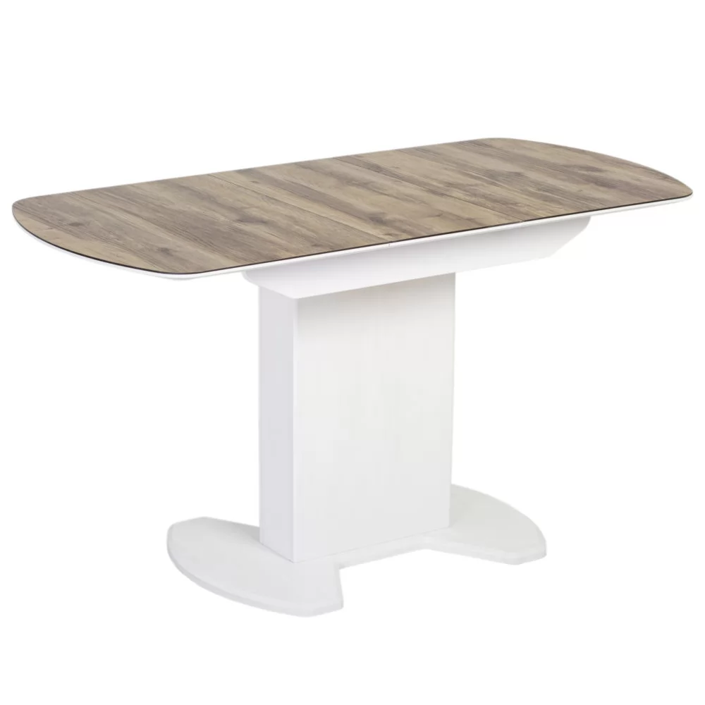 Стол раздвижной выполнен из МДФ 22 мм, покрытого закаленным стеклом 4 мм спеченным с пластиком HPL, вставка цельная 32 см хранится внутри стола. Стоит на опоре-колонне из МДФ с основанием эргономичной формы.