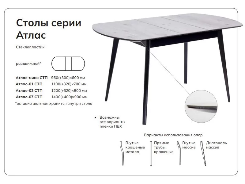 Стол раздвижной выполнен из МДФ 22 мм, покрытого закаленным стеклом 4 мм спеченным с пластиком HPL, вставка цельная 32 см хранится внутри стола. В базовой комплектации опоры массив диагональные.