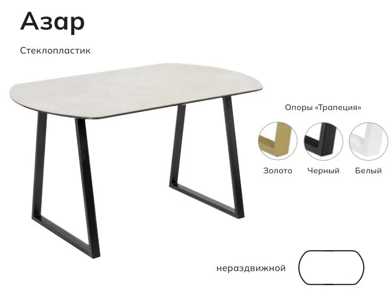 Стол нераздвижной полуовальной формы, выполнен из МДФ 22 мм, покрытого закаленным стеклом 4 мм спеченным с пластиком HPL. Опоры трапеция из профильной трубы черные матовые, белые глянцевые либо под золото