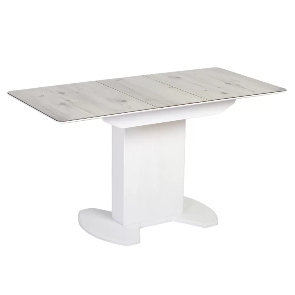 Стол раздвижной выполнен из МДФ 19 мм, покрытого закаленным стеклом 4 мм спеченным с пластиком HPL, вставка цельная с механизмом автоподъема 32 см. Стоит на опоре-колонне из МДФ с основанием эргономичной формы.