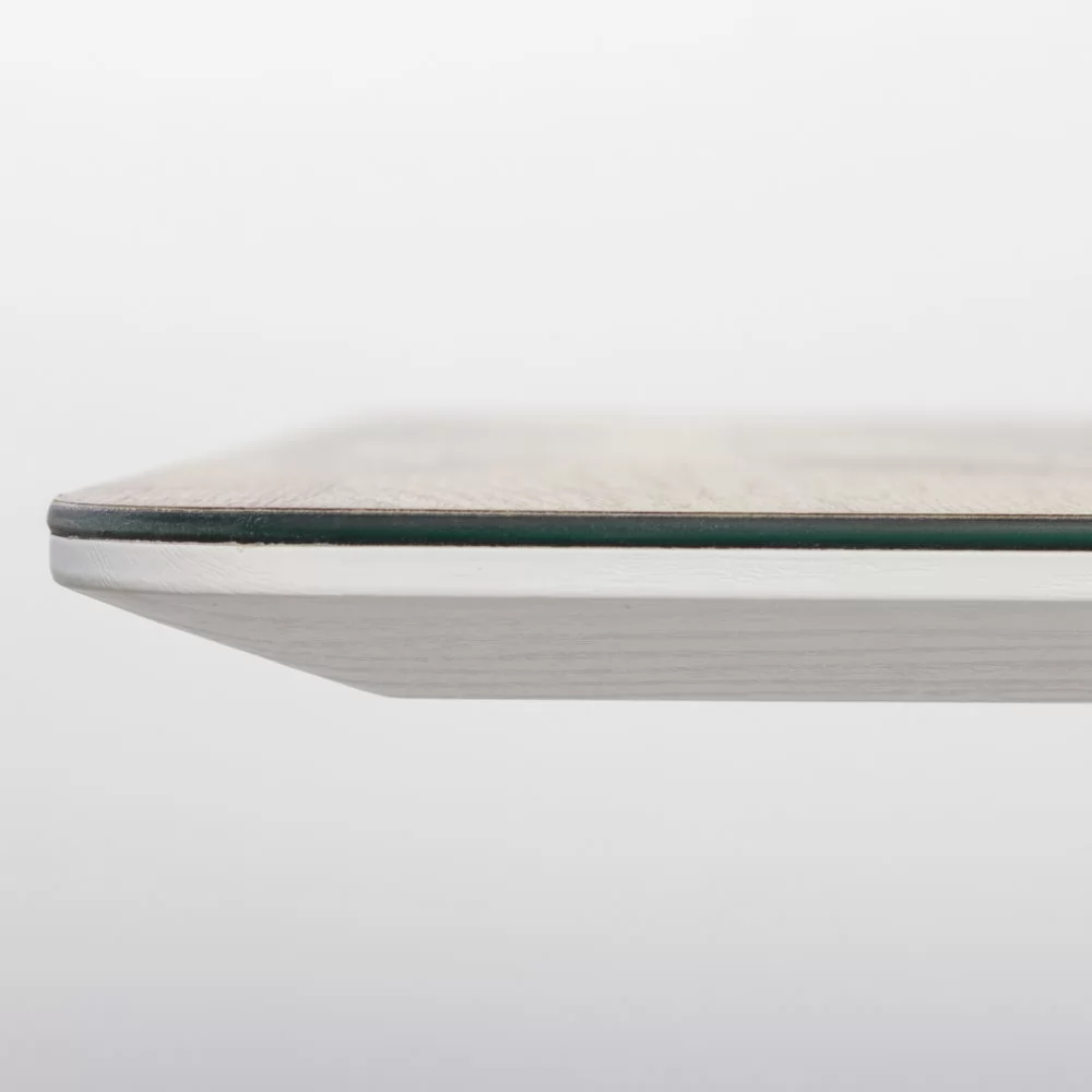 Стол нераздвижной выполнен из МДФ 22 мм, покрытого закаленным стеклом 4 мм спеченным с пластиком HPL. В базовой комплектации опоры массив квадратные.