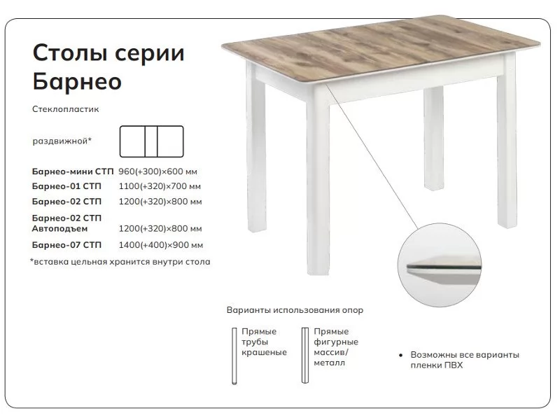 Стол раздвижной выполнен из МДФ 22 мм, покрытого закаленным стеклом 4 мм спеченным с пластиком HPL, вставка цельная 30 см хранится внутри стола. В базовой комплектации опоры массив квадратные.