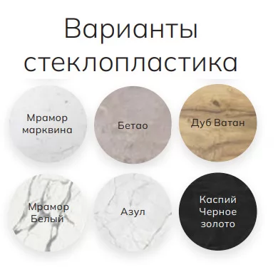 | Стеклопластик: | Бетао, Дуб вотан, Мрамор белый, Мрамор марквина, Каспий черное золото, Азул |
