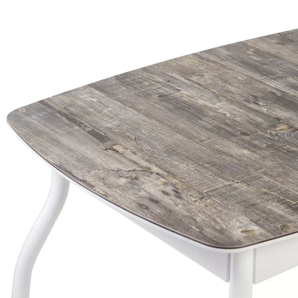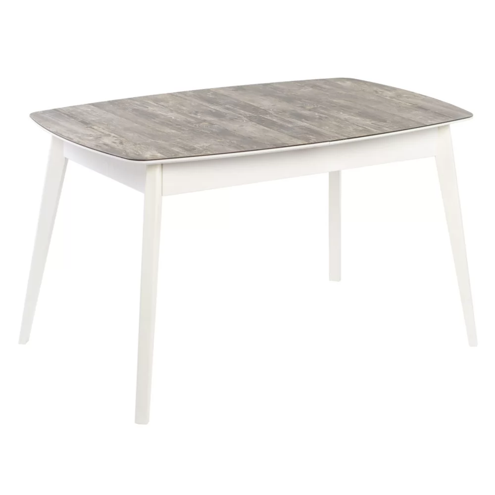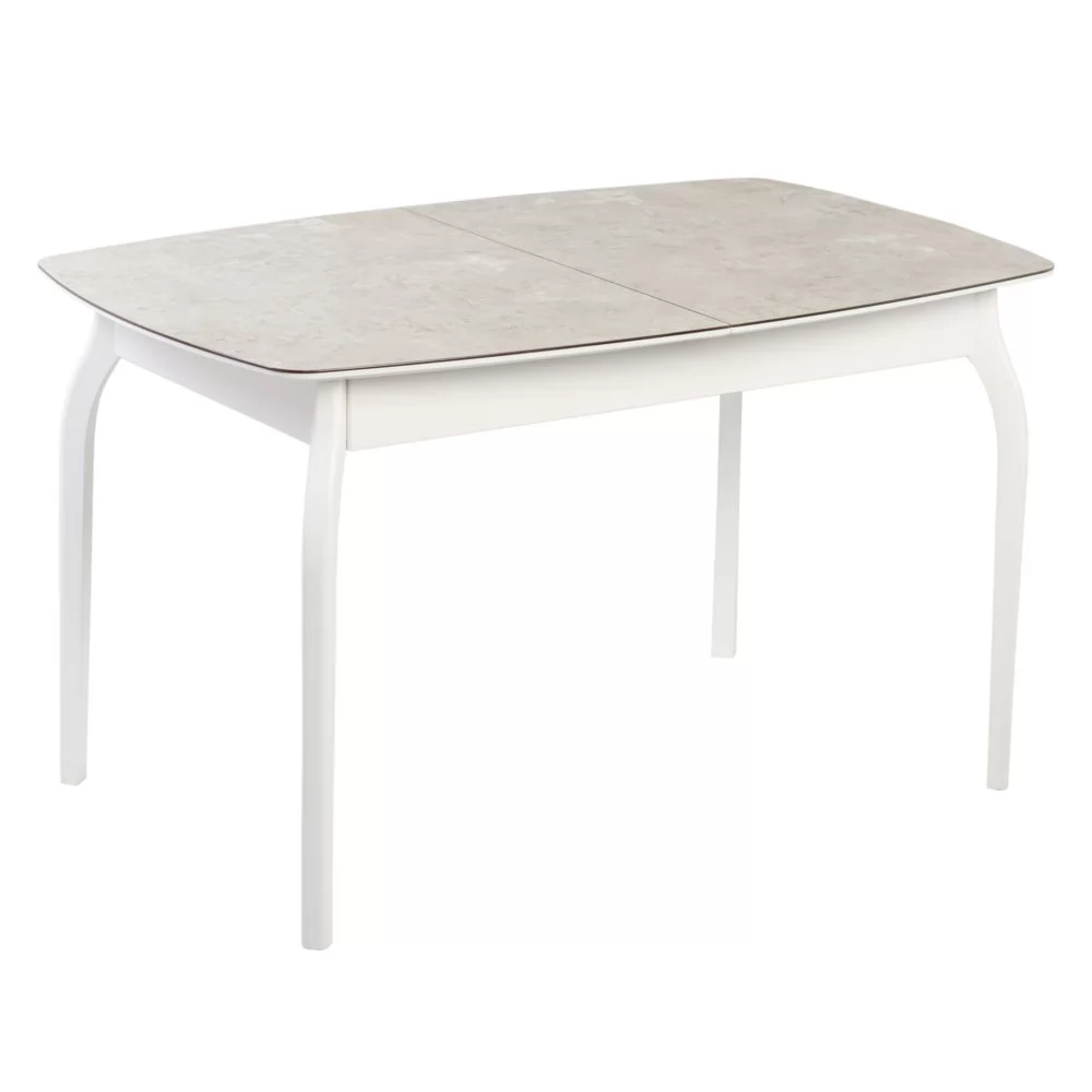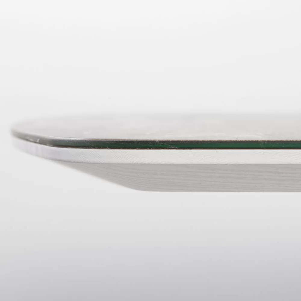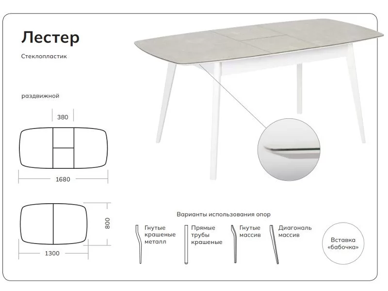Стол раздвижной выполнен из МДФ 22 мм, покрытого закаленным стеклом 4 мм спеченным с пластиком HPL, вставка-бабочка из ЛДСП 38 см. В базовой комплектации опоры массив диагональные.