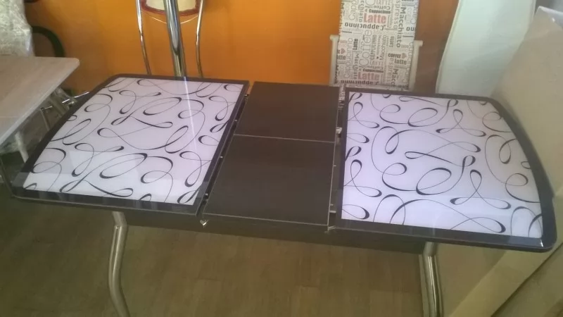 Обеденный раздвижной стол Чикаго СТ (6191) фотопечать- креативный обеденный стол. Механизм раскладки- синхронно -раздвижной (бабочка). В разложенном виде стеклянные половинки столешницы разделяет вставка из ДСП. Интересное сочетание в исполнение столешницы ДСП и закаленного стекла с инкрустацией придаст шарм вашей кухне.