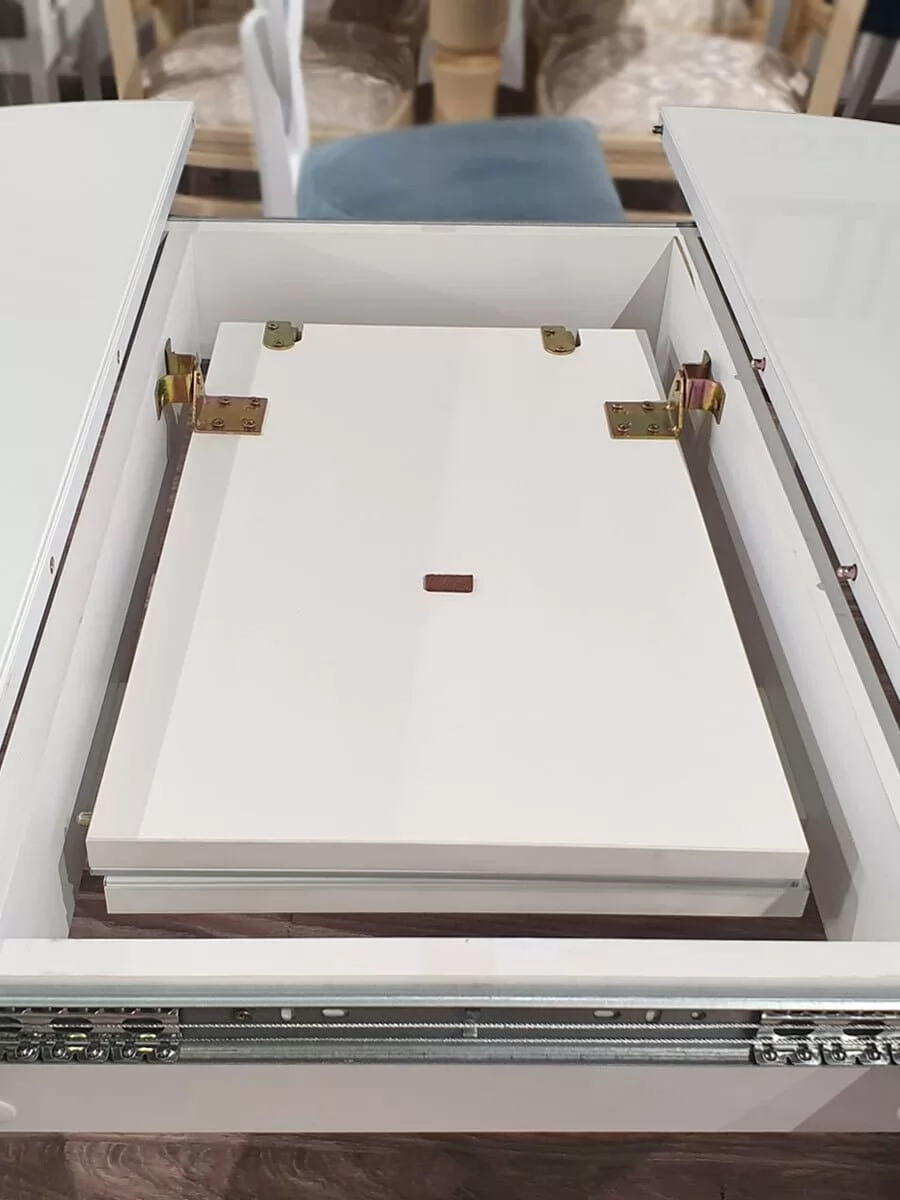 Классическая форма стола и один из самых любимых вариантов у наших Покупателей. Этому есть масса объяснений: размер стола компактный и в то же время достаточно вместительный для ежедневного использования 4-х человек; по каждой стороне достаточно места, чтобы поставить 4 широких стула вокруг стола; механизм раздвижения со стеклянной вставкой позволяет комфортно посадить еще 2-х гостей.