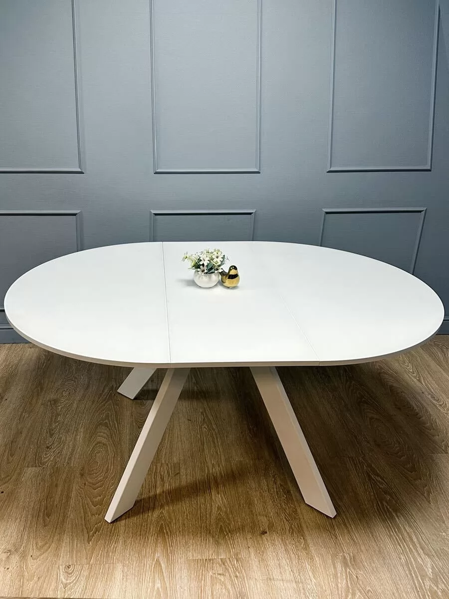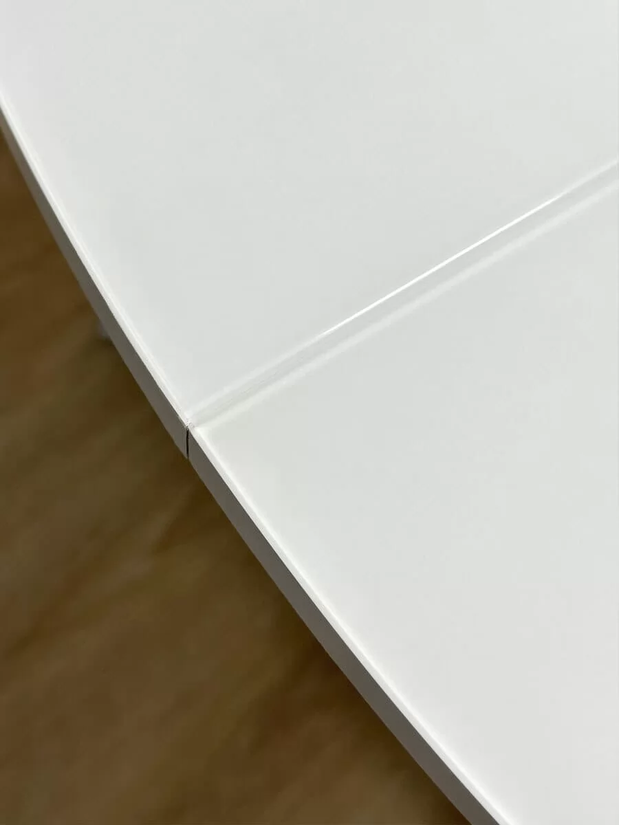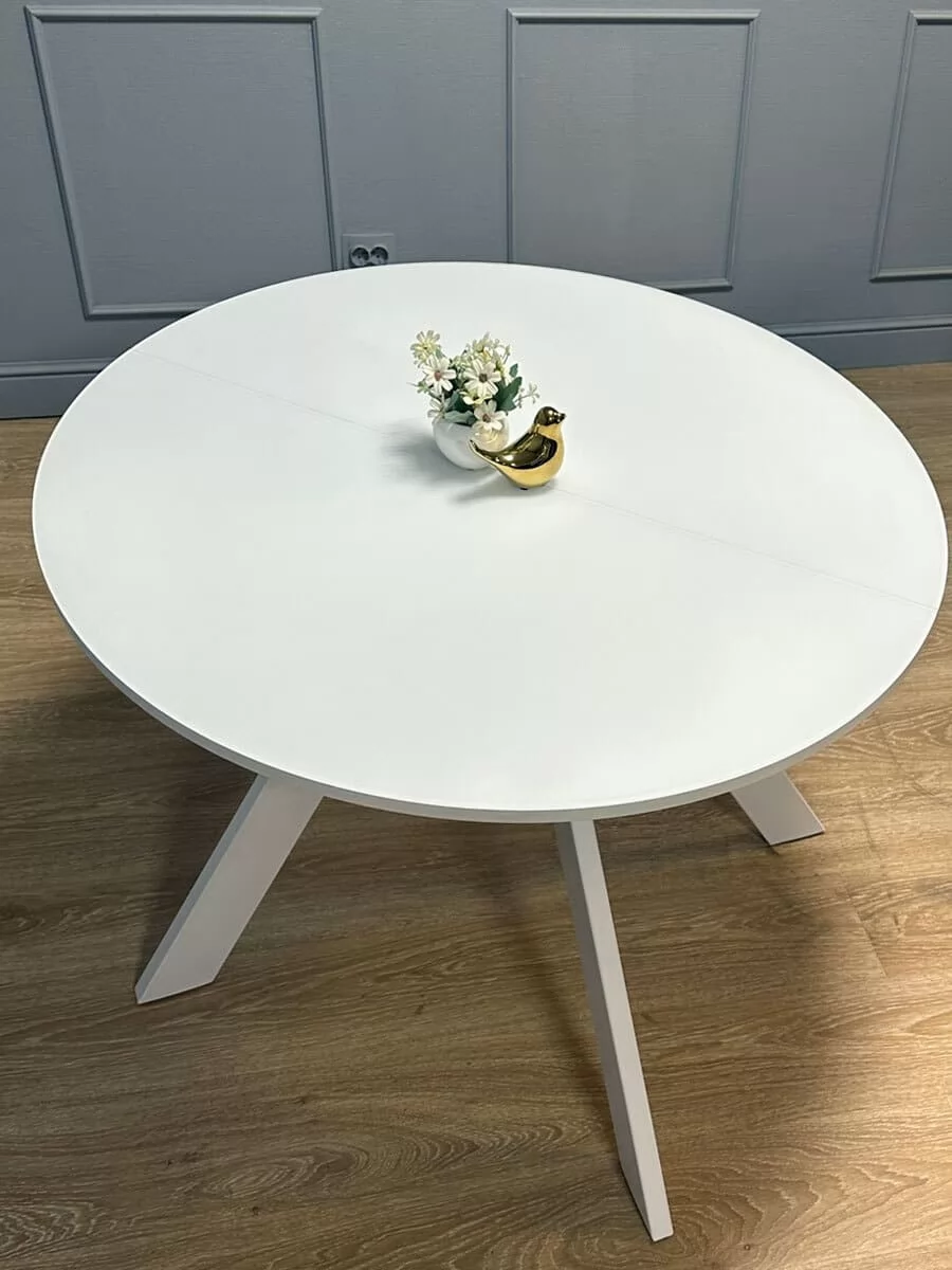 Стол на центральной опоре немного напоминает летающую тарелку. Это один из самых удобных круглых столов, которые Вы можете купить в России. Широкий разлёт опор позволяет поставить к столу любые, самые широкие кресла. Оптимальный размер позволяет удобно разместить 4 человека за столом в сложенном состоянии и 6-8 в разложенном. Толстая, надёжная столешница и металлическая рама, которая позволяет работать механизму раскладки легко и чётко как часы.