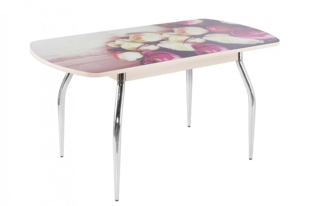 Стол (раздвижной) выполнен из ЛДСП 22 мм, покрытого закаленным стеклом 4 мм с безопасной фаской, с UV-печатью высокой четкости, вставка 40 см покрытая также закаленным стеклом с UV-печатью хранится внутри стола. В базовой комплектации опоры гнутые хром.