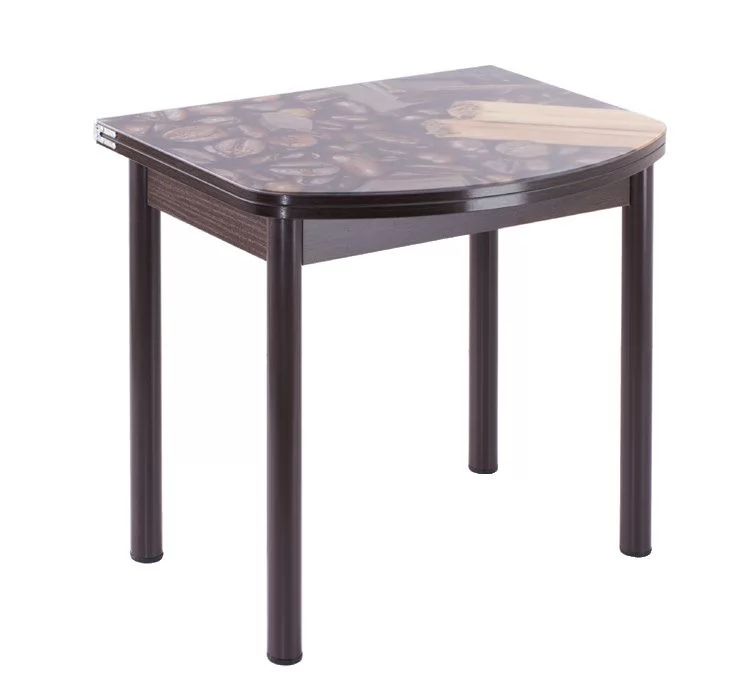 Стол приставной поворотно-раскладной. Столешница выполнена из ламинированного ДСП. В базовой комплектации опоры прямые крашенные. В сложенном состоянии верхняя столешница с закаленным стеклом 4мм с фотопечатью