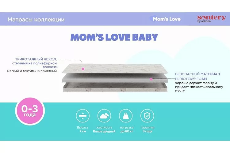 Матраc MOM'S LOVE Baby 700*1600мм (материал Periotek Form, чехол хлопок, жёсткий, h7см)