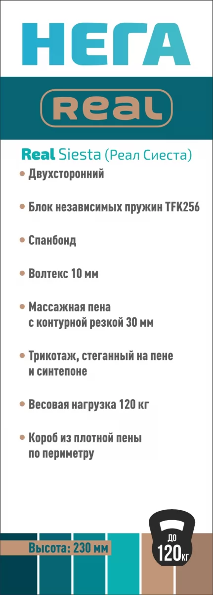 В матрасе Real Siesta с обеих сторон используется пятизональная массажная пена (30 мм) с контурной 3D резкой, которая придает матрасу дополнительный воздухообмен за счет глубокой рифленой поверхности, а также дарит ощущения приятного массажного эффекта.Необходимую жесткость матрасу придает слой современного волтекса: плотный, дышащий материал с натуральными волокнами льна, хлопка и шерсти. Матрас Реал Сиеста понравится всем, кто предпочитает матрасы повыше, а также тем, кто ищет альтернативу матрасам с латексированным кокосом.