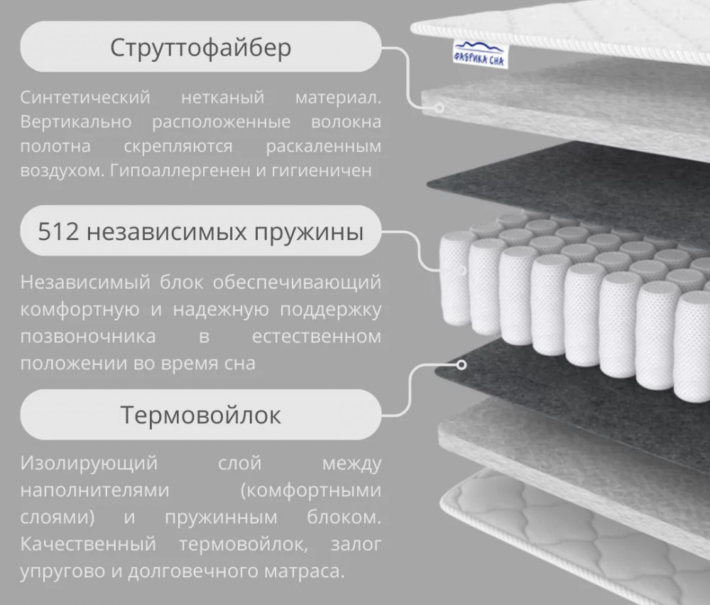 Состав: Струттофайбер - 3 см/Термовойлок/Блок независимых пружин/Термовойлок/ Струттофайбер - 3 см