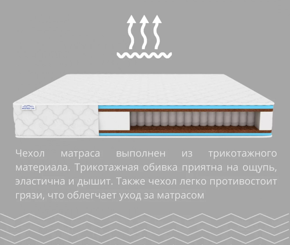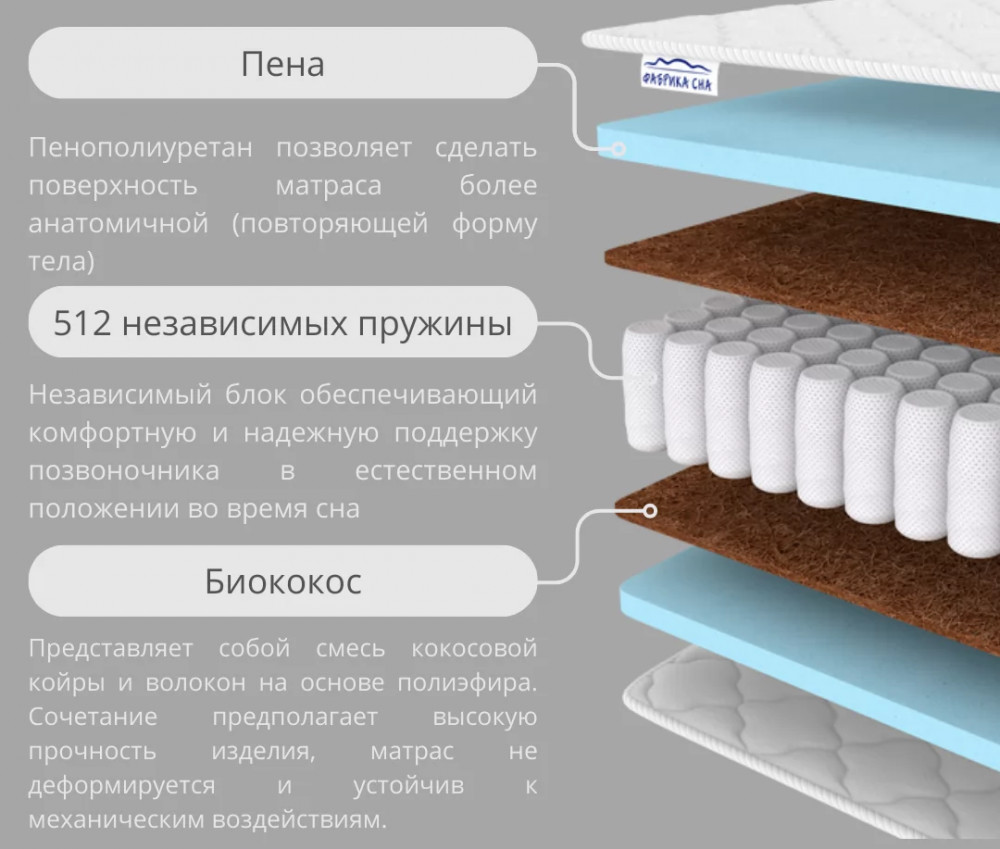 Состав: Пенополиуретан - 3 см/Био-кокос 1 см/Блок независимых пружин/Био-кокос 1 см/ Пенополиуретан - 3 см