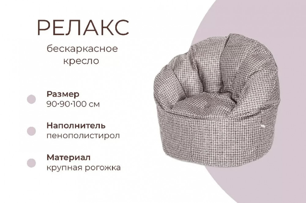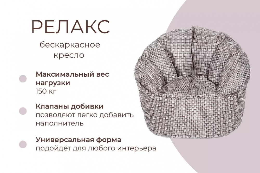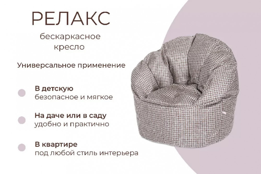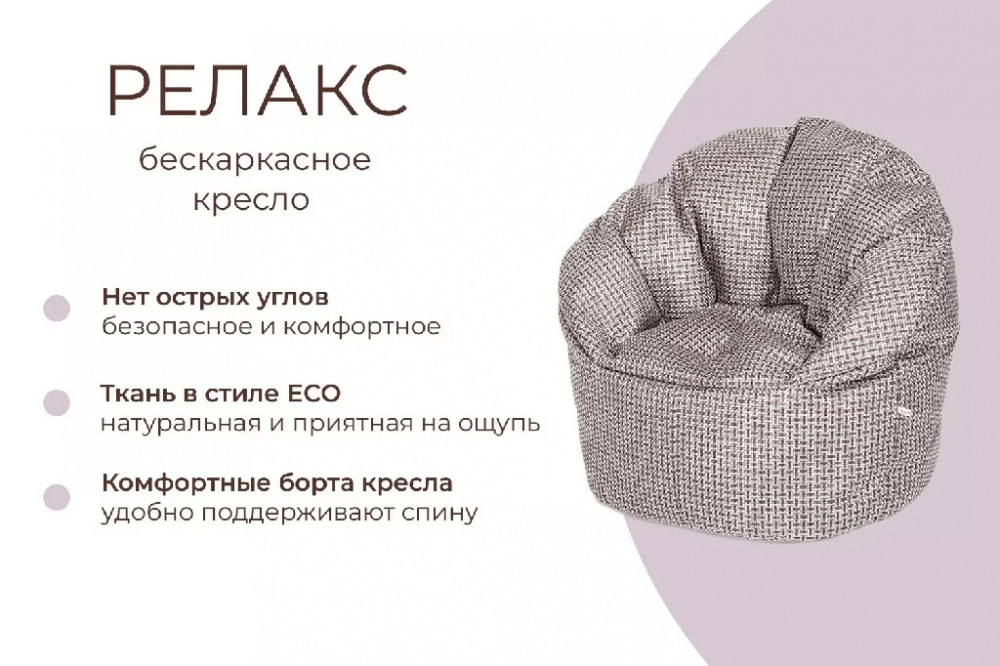 РЕЛАКС в фактурной мебельной рогожке с фактурным переплетением - большое и уютное облако, большого размера удобной формы- очень понравится всем взрослым, добавит настроение уюта и новые эмоции в отдых с семьей и друзьями. Вы будете утопать в его мягкости.
