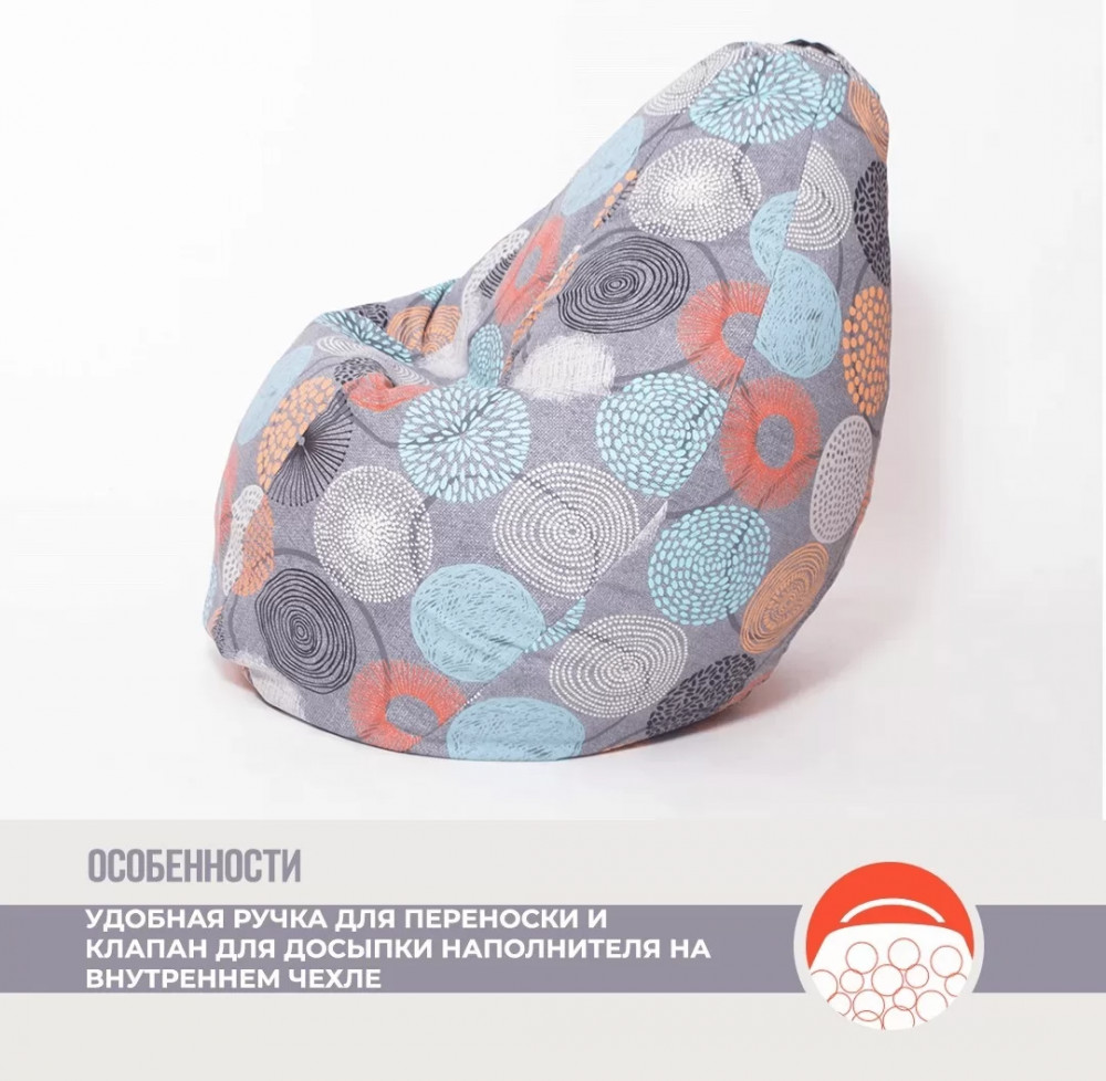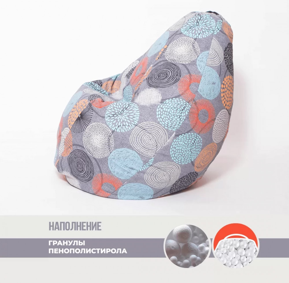 Наполнено гранулами шариками пенополистирола, которые при использовании кресла принимают форму и изгибы тела, за счет чего изделие очень удобное и расслабляет спину, снимает напряжение. Благодаря такому наполнителю изделие легкое и его может перемещать даже ребенок.