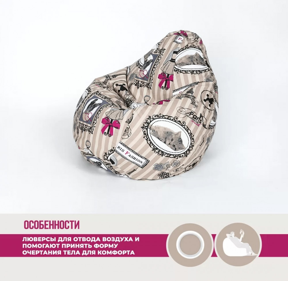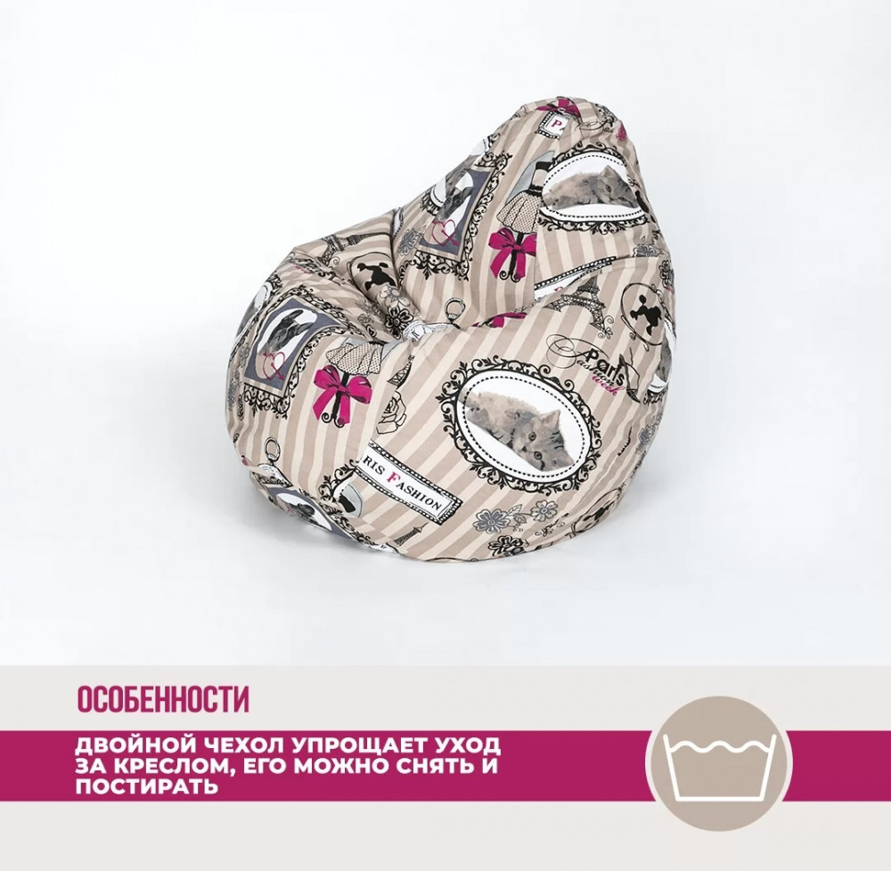 Верх изделия оснащен молнией, при помощи которой чехол снимается для влажной уборки пятен. Внутренний чехол выполнен из плотной нетканной ткани с клапаном для донасыпки наполнителя.