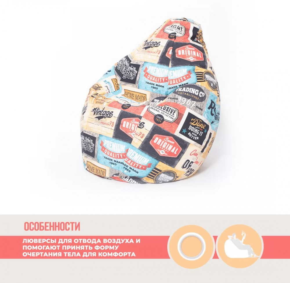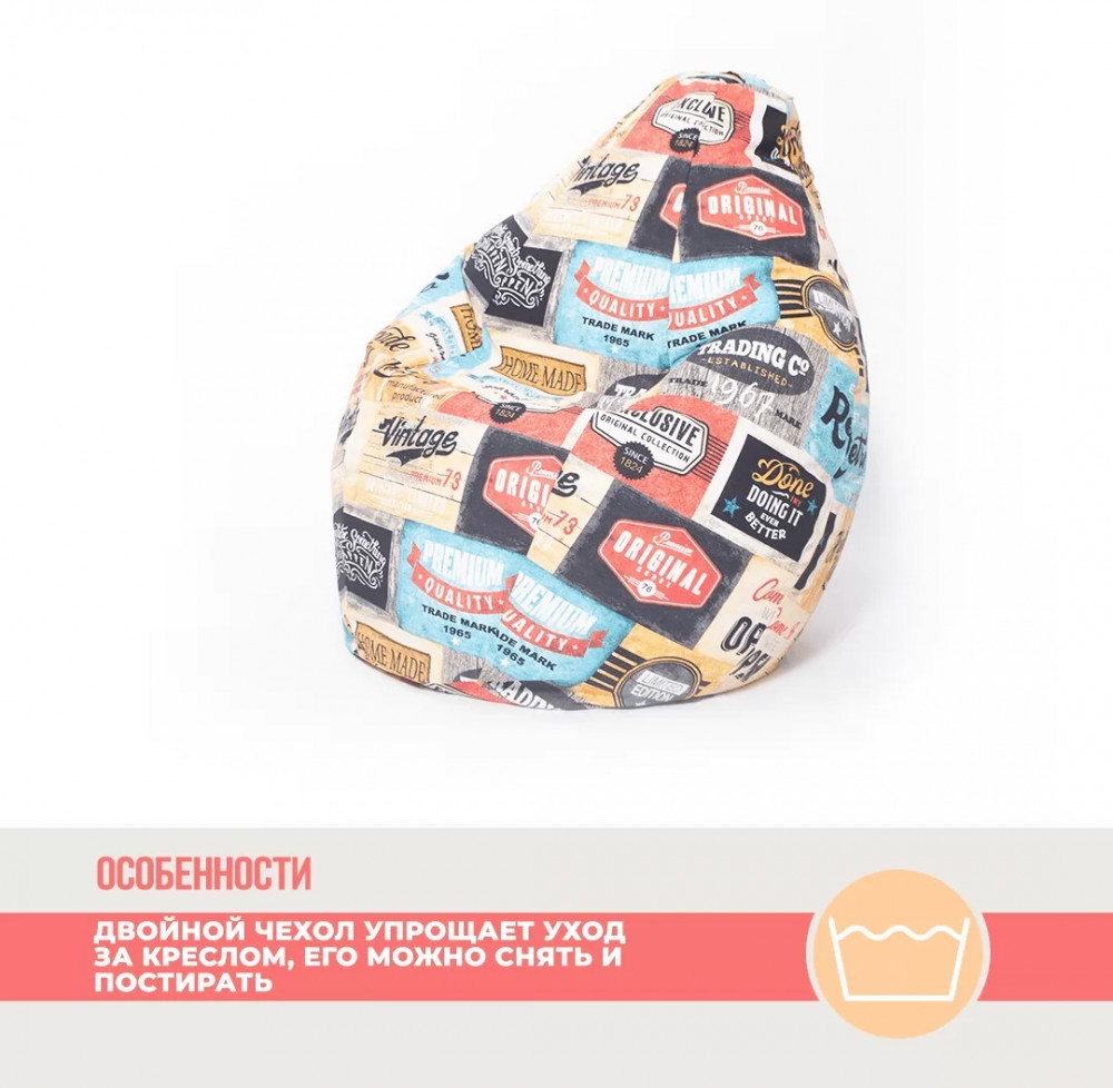 Верх изделия оснащен молнией, при помощи которой чехол снимается для влажной уборки пятен. Внутренний чехол выполнен из плотной нетканной ткани с клапаном для донасыпки наполнителя.