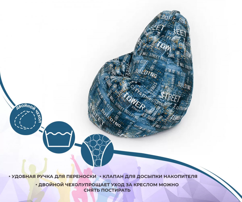 Верх изделия оснащен молнией, при помощи которой чехол снимается для влажной уборки пятен. Внутренний чехол выполнен из плотной нетканной ткани с клапаном для донасыпки наполнителя.