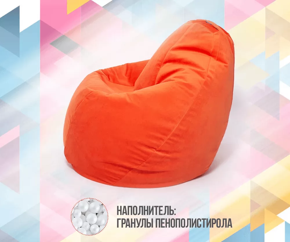 Наполнено гранулами шариками пенополистирола, которые при использовании кресла принимают форму и изгибы тела, за счет чего изделие очень удобное и расслабляет спину, снимает напряжение. Благодаря такому наполнителю изделие легкое и его может перемещать даже ребенок.