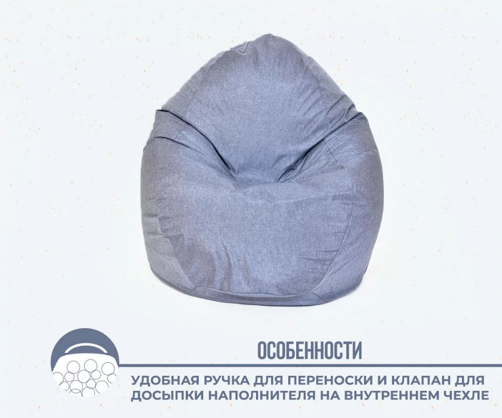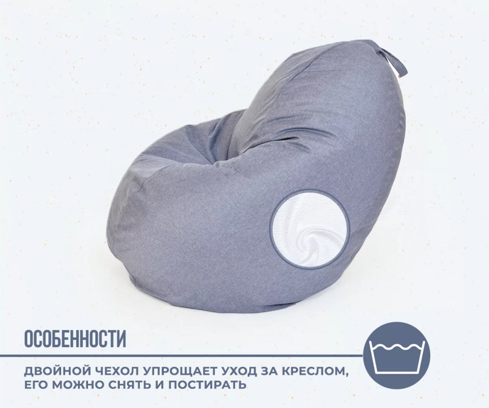 Двойной чехол упрощает уход за креслом, его можно снять и постирать. Удобная ручка для переноски и клапан для досыпки наполнителя на внутреннем чехле.