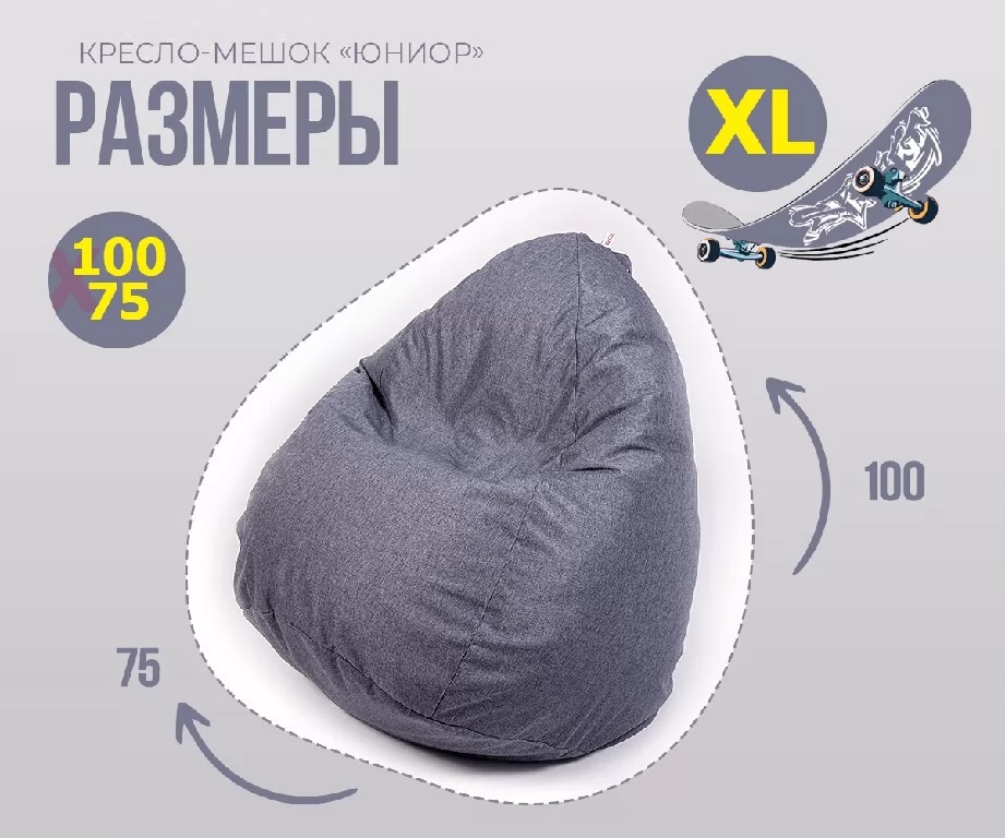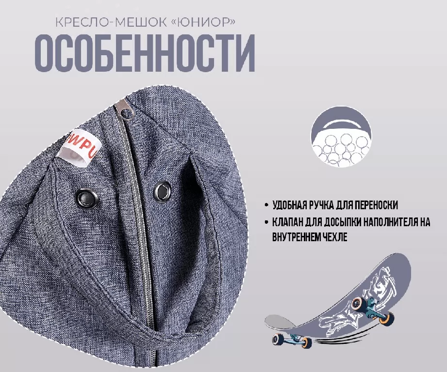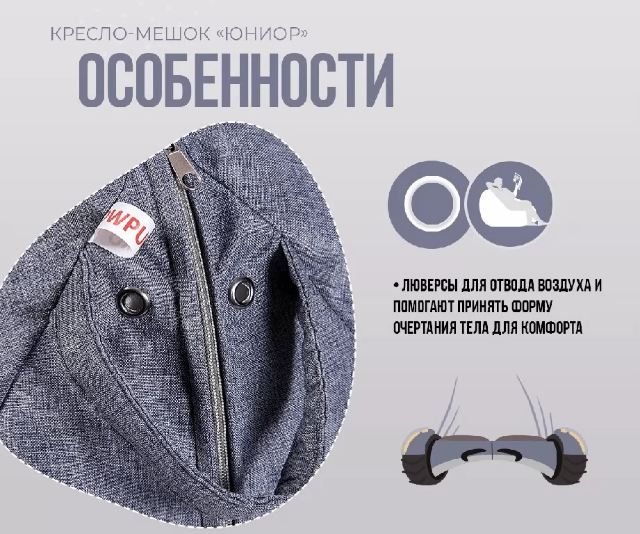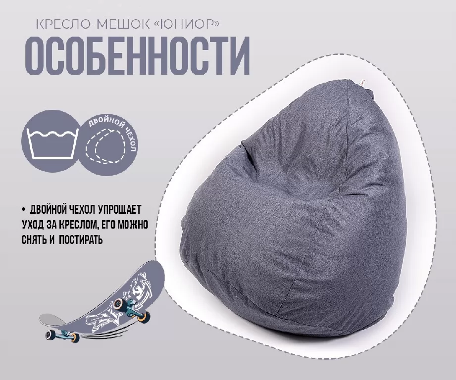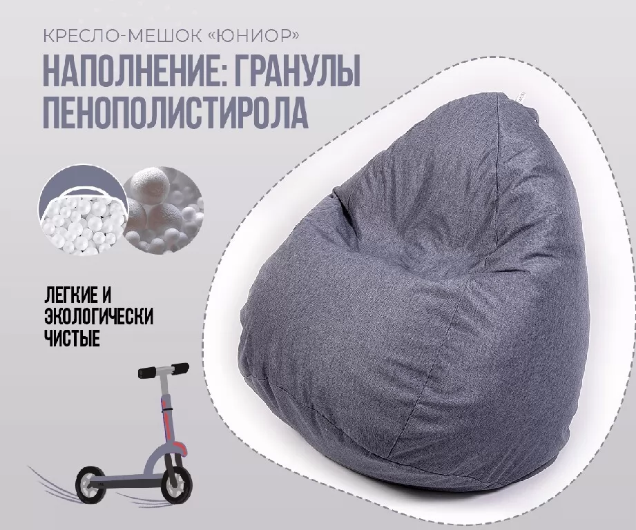 Наполнено гранулами шариками пенополистирола, которые при использовании кресла принимают форму и изгибы тела, засчет чего изделие очень удобное и расслабляет спину, снимает напряжение. Благодаря такому наполнителю изделие легкое и его может перемещать даже ребенок.