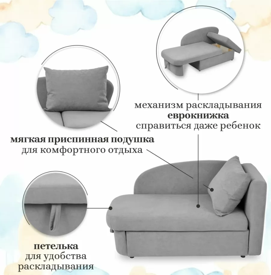Диван 1050 раскладывается в полноценное спальное место 65х180 см. Оно подходит для ежедневного сна и не требует покупки дополнительного матраса. Спальное место в меру жесткое, для равномерного распределения нагрузки на позвоночник и поддержания его правильной формы. С легким механизмом трансформации «еврокнижка» справится даже ребенок. Для раскладывания дивана нужно выкатить сидение вбок за специальную петлю и опустить спинку, получив таким образом ровное спальное место. Специально установленные ролики облегчают и ускоряют этот процесс.