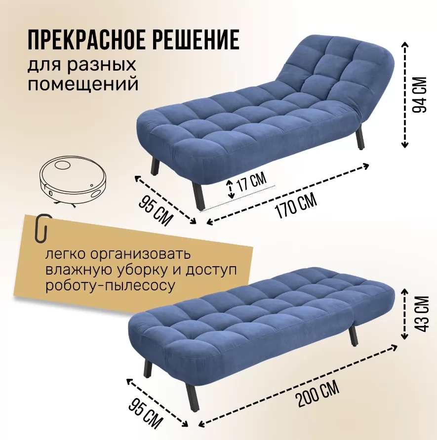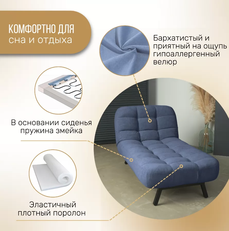 Кушетка Vita - изысканный предмет, который влюбляет в себя с первого взгляда. Она станет самым частым местом отдыха у всей семьи. Регулируемая спинка с 4 положениями, сиденье средней жёсткости и комфортная длина позволяют расправить спину, разгрузить позвоночник и вытянуть ноги для полноценного отдыха. Это прекрасное место для работы с ноутбуком, просмотра журналов или чтения книг. Встроенный механизм трансформации спинки турецкого производства. Он не только опускает и поднимает спинку в горизонтальное и вертикальное положения, но и позволяет устанавливать 2 положения релакс (45 и 25 градусов). Положения релакс – лучшее решение для отдыха в конце рабочего дня. На такой кушетке обязательно захочется отдохнуть, расслабится и набраться сил для новых целей. Кушетка Vita - это находка для будущих мам. Комфортное положение спинки снизит нагрузку на позвоночник при кормлении малыша, а удлинённое основание обеспечит отдых для ваших ножек, сохраняя здоровье и красоту. Оптимальная ширина кушетки вмещает маму с ребёнком, а также двух детей или влюблённых в крепких объятьях. Кушетка Vita, заменит не только обычное привычное многим кресло, но и станет комфортным спальным местом (95 х 200 см) для взрослого человека. С мебелью коллекции Vita вы забудете о передвижении мебели, во время уборки. Высота ножек у кушетки - 17 см. Проводить влажную уборку самостоятельно и при помощи робота-пылесоса станет намного проще. Неровность пола, стыки с ковровым покрытием вы легко отрегулируете подпятниками. Они же защитят напольное покрытие от повреждений. В своём интерьере вы сможете собрать всю коллекцию Vita, в которую входит: диван, кушетка, кресло и пуф. Модели можно комбинировать друг с другом по вашему желанию. Ткань обивка кушетки выполнена из мягкого, приятного и «дышащего» велюра с отсутствующим пальчиковым эффектом. Ткань износостойкая с влагоотталкивающей пропиткой – легко моется и быстро сохнет.