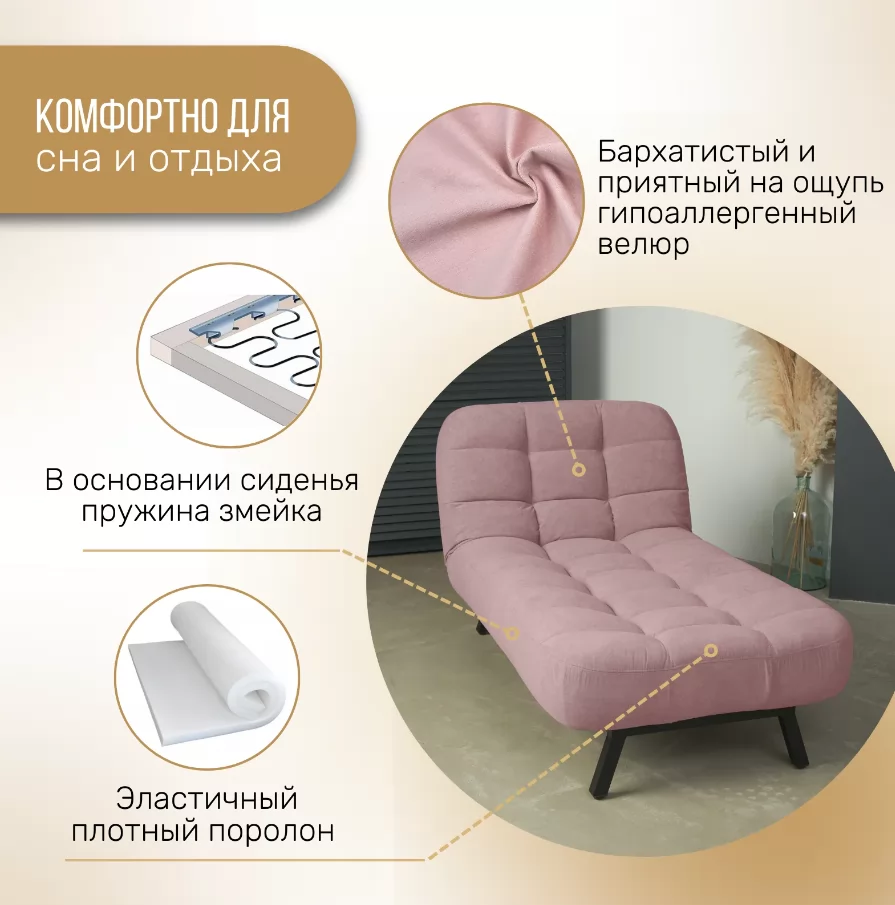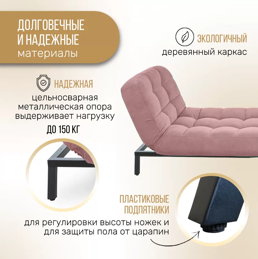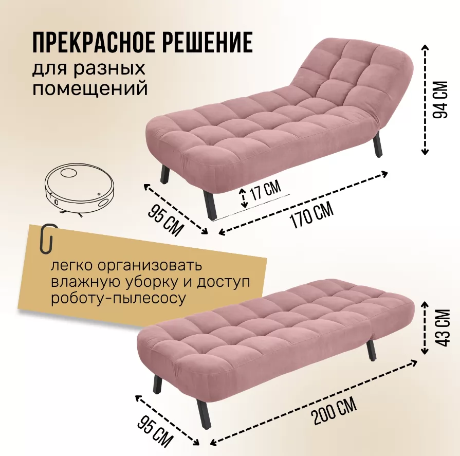 Кушетка Vita - изысканный предмет, который влюбляет в себя с первого взгляда. Она станет самым частым местом отдыха у всей семьи. Регулируемая спинка с 4 положениями, сиденье средней жёсткости и комфортная длина позволяют расправить спину, разгрузить позвоночник и вытянуть ноги для полноценного отдыха. Это прекрасное место для работы с ноутбуком, просмотра журналов или чтения книг. Встроенный механизм трансформации спинки турецкого производства. Он не только опускает и поднимает спинку в горизонтальное и вертикальное положения, но и позволяет устанавливать 2 положения релакс (45 и 25 градусов). Положения релакс – лучшее решение для отдыха в конце рабочего дня. На такой кушетке обязательно захочется отдохнуть, расслабится и набраться сил для новых целей. Кушетка Vita - это находка для будущих мам. Комфортное положение спинки снизит нагрузку на позвоночник при кормлении малыша, а удлинённое основание обеспечит отдых для ваших ножек, сохраняя здоровье и красоту. Оптимальная ширина кушетки вмещает маму с ребёнком, а также двух детей или влюблённых в крепких объятьях. Кушетка Vita, заменит не только обычное привычное многим кресло, но и станет комфортным спальным местом (95 х 200 см) для взрослого человека. С мебелью коллекции Vita вы забудете о передвижении мебели, во время уборки. Высота ножек у кушетки - 17 см. Проводить влажную уборку самостоятельно и при помощи робота-пылесоса станет намного проще. Неровность пола, стыки с ковровым покрытием вы легко отрегулируете подпятниками. Они же защитят напольное покрытие от повреждений. В своём интерьере вы сможете собрать всю коллекцию Vita, в которую входит: диван, кушетка, кресло и пуф. Модели можно комбинировать друг с другом по вашему желанию. Ткань обивка кушетки выполнена из мягкого, приятного и «дышащего» велюра с отсутствующим пальчиковым эффектом. Ткань износостойкая с влагоотталкивающей пропиткой – легко моется и быстро сохнет.