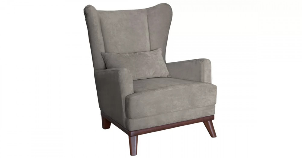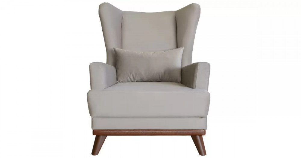 Высокая спинка с наклоном и мягкие подлокотники обеспечивают удобную посадку, дополнительный комфорт создает декоративная подушка. Царга кресла обтянута искусственной кожей в цвет опорам.