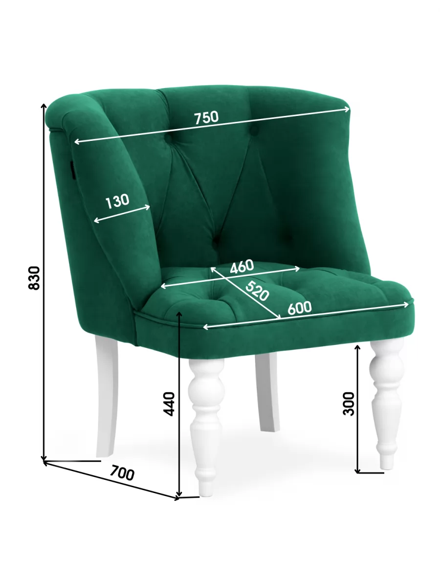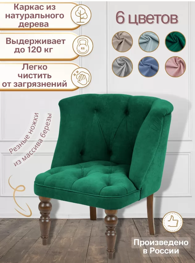 Шикарное Кресло 7778 с каретной стяжкой прекрасно впишется как в классический, так и современный интерьер. Каркас изготовлен из массива дерева хвойных пород и березовой фанеры, наполнитель – пенополиуретан, что означает повышенную прочность и службу на долгие годы. У стула изящные передние резные ножки из натурального дерева белого цвета. Обивка из бархатистого велюра с влагоотталкивающей пропиткой, высокой износостойкостью, ее легко чистить. Кресло прекрасно подойдет для небольших помещений: компактной кухни, детской, коридора, комнаты, кабинета, офиса, фойе. Такое кресло никого не оставит равнодушным.