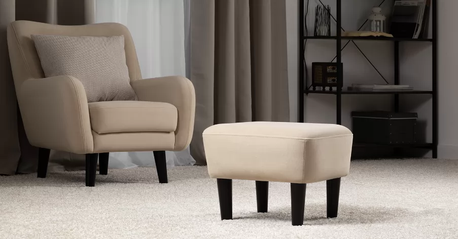 Мягкие линии и визуальная легкость — отличительные черты пуфа Дакота. Гармонично дополнит диван и кресло из этой коллекции.