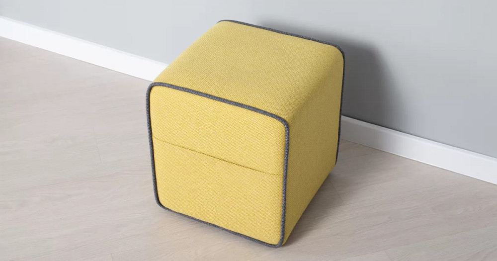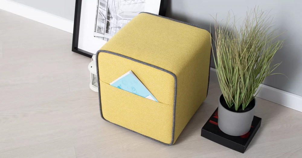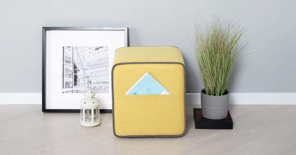 Боковые карманы на противоположных сторонах пуфа, два противоположных торца оформлены контрастным кантом
