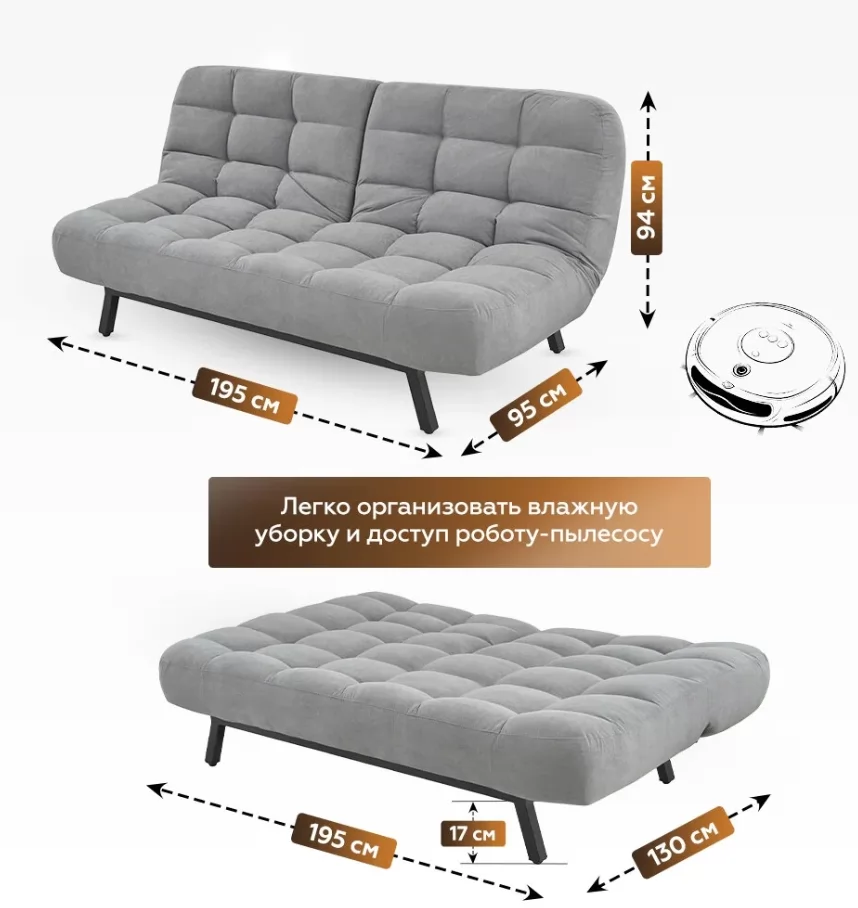 С диваном Vita вы сможете забыть о передвижении мебели, во время уборки. Высота ножек 17 см позволяет с легкость проводить как влажную уборку, так и обеспечивать комфортную работу роботу-пылесосу. Неровность пола, стыки с ковровым покрытием вы легко отрегулируете подпятниками дивана. А также они сохранят напольное покрытие от повреждений.