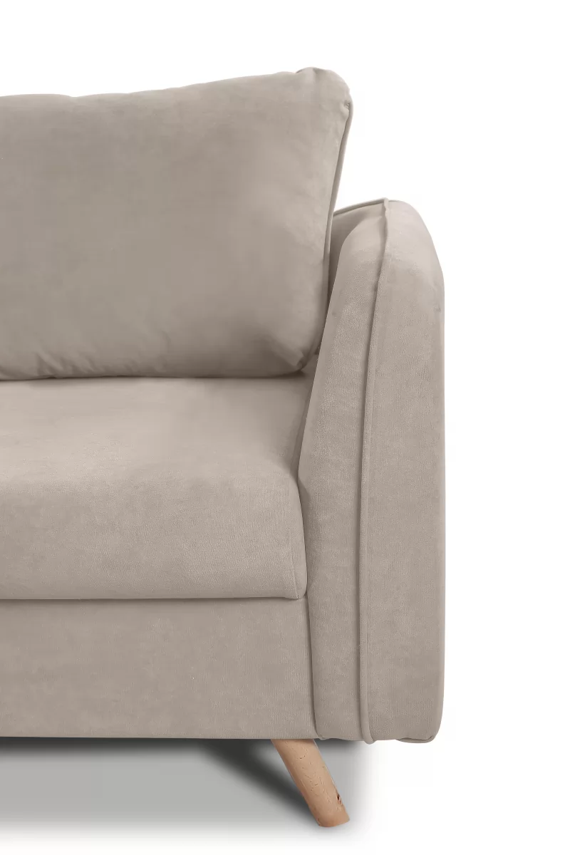 Узкие подлокотники дивана, зрительно подчёркивают его элегантность и экономят пространство. Высокие деревянные ножки 12 см, с подпятниками из войлока обеспечивают защиту напольного покрытия и удобство для уборки роботу пылесосу.