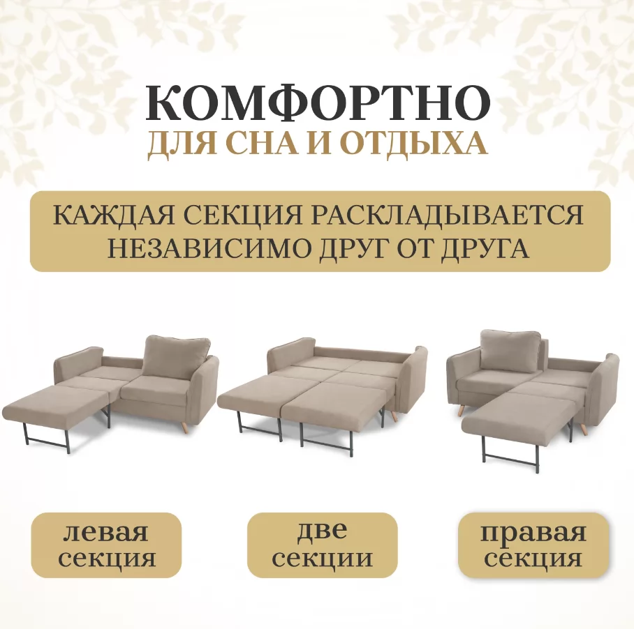 При своих компактных размерах диван Бертон очень вместительный. Он раскладывается в ровную монолитную поверхность для здорового сна, стыки между секциями не ощущаются. Размер спального места 140х195 см. Для вашего удобства предусмотрены петли для раскладывания дивана.