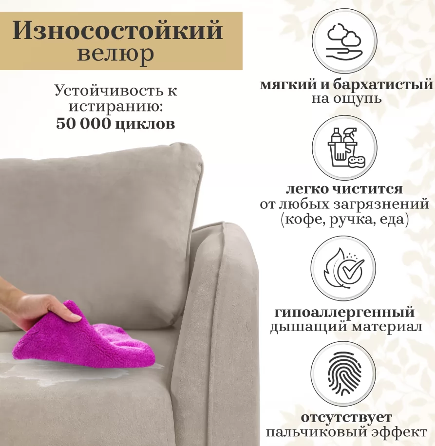 Обивка дивана выполнена из мягкого, приятного и «дышащего» велюра с отсутствующим пальчиковым эффектом. Богатая палитра ткани позволяет подобрать наиболее подходящий оттенок для вашего интерьера. Ткань износостойкая с влагоотталкивающей пропиткой – пролитый кофе или сок не испортят вам настроение и внешний вид дивана. Особенность этой ткани в лёгкой чистке и быстрой сушке обивки, что позволяет содержать диван в чистоте многие годы.
