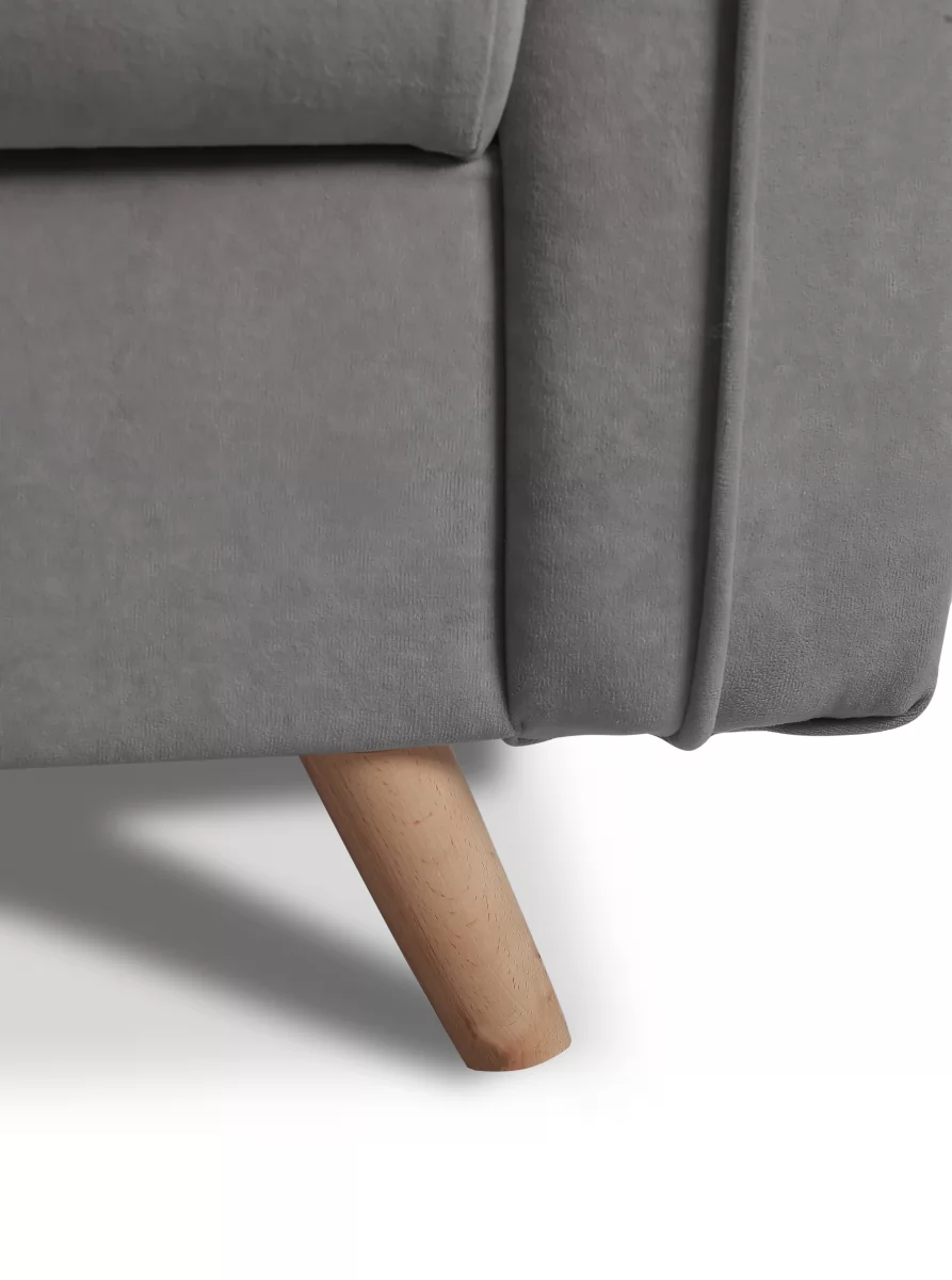 Узкие подлокотники дивана, зрительно подчёркивают его элегантность и экономят пространство. Высокие деревянные ножки 12 см, с подпятниками из войлока обеспечивают защиту напольного покрытия и удобство для уборки роботу пылесосу.