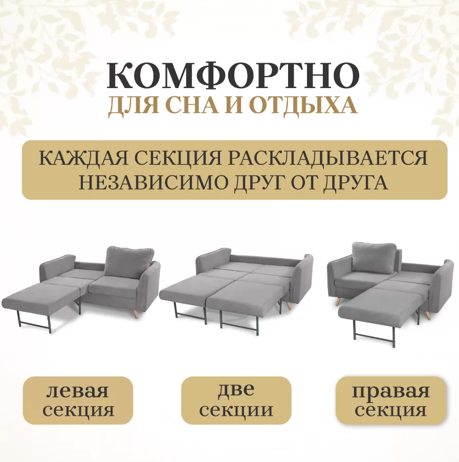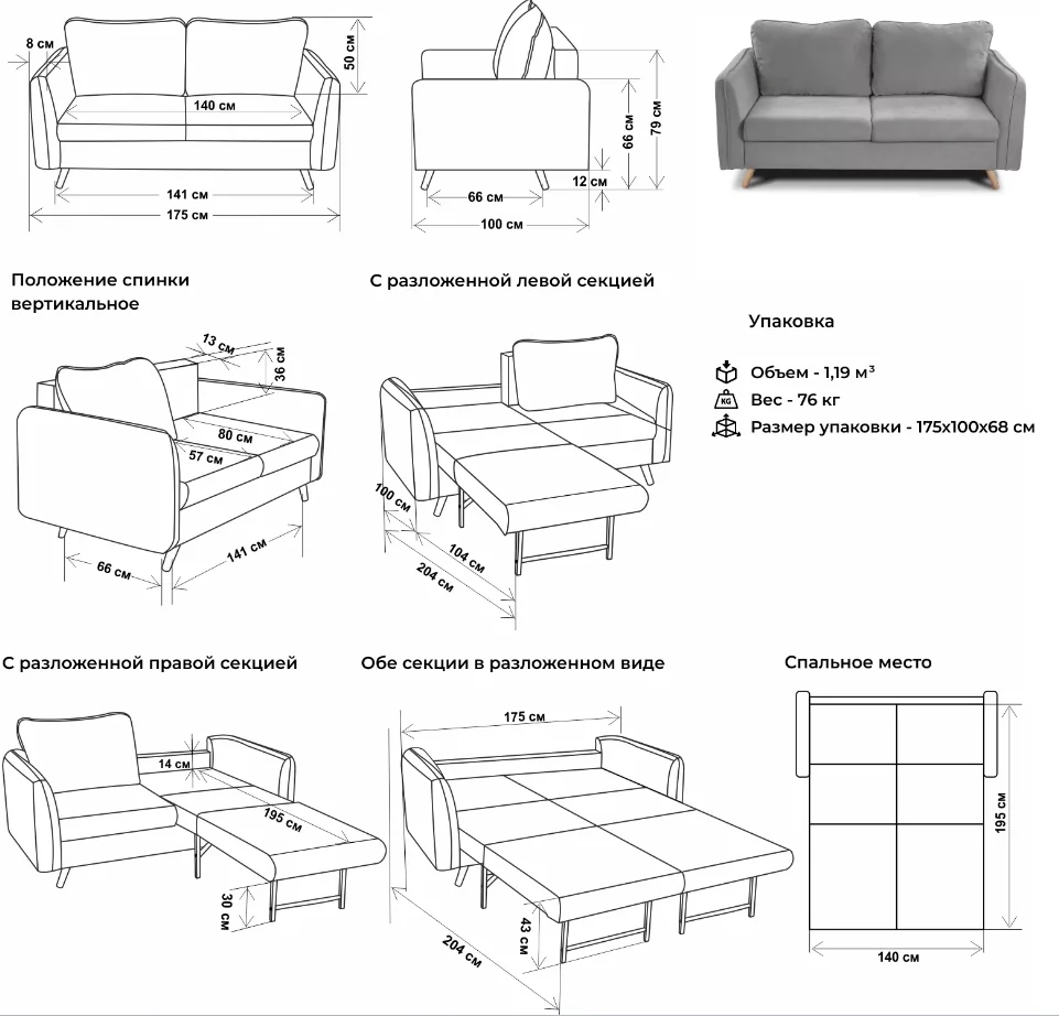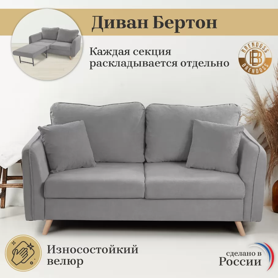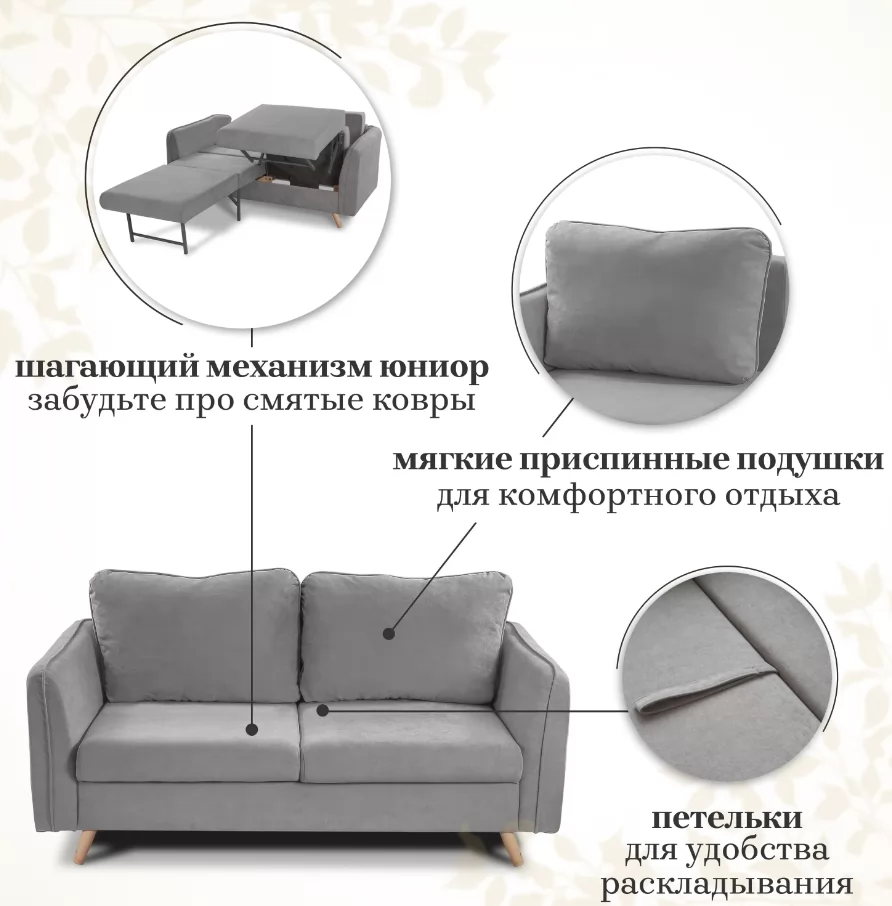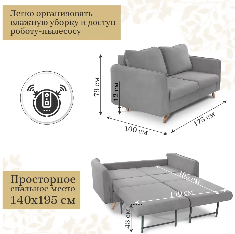 При своих компактных размерах диван Бертон очень вместительный. Он раскладывается в ровную монолитную поверхность для здорового сна, стыки между секциями не ощущаются. Размер спального места 140х195 см. Для вашего удобства предусмотрены петли для раскладывания дивана.