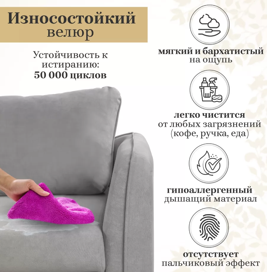 Обивка дивана выполнена из мягкого, приятного и «дышащего» велюра с отсутствующим пальчиковым эффектом. Богатая палитра ткани позволяет подобрать наиболее подходящий оттенок для вашего интерьера. Ткань износостойкая с влагоотталкивающей пропиткой – пролитый кофе или сок не испортят вам настроение и внешний вид дивана. Особенность этой ткани в лёгкой чистке и быстрой сушке обивки, что позволяет содержать диван в чистоте многие годы.