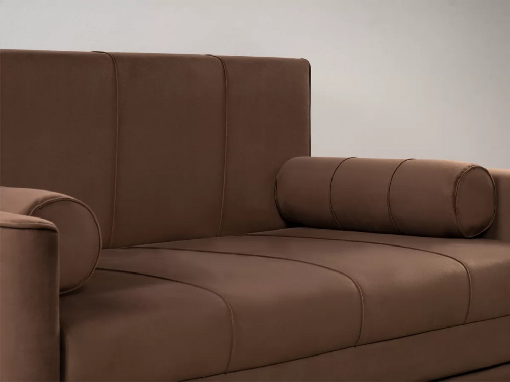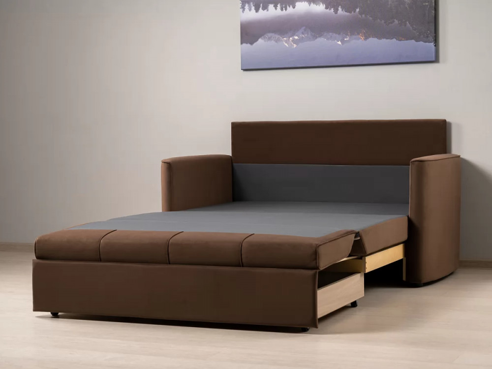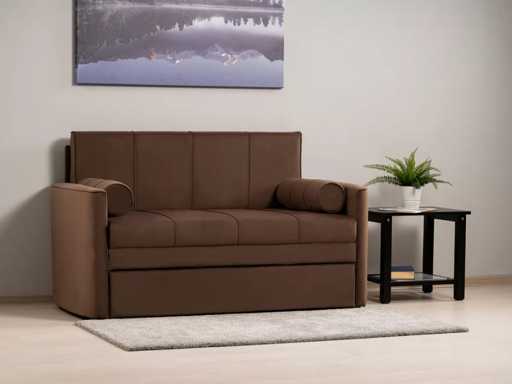 Диван-кровать Мелани Р (120) - компактный современный диванчик. Скругленные подлокотники с кантами подчеркивают эргономичность модели. Простой и надежный механизм трансформации на каждый день обеспечит удобным спальным местом ребенка или подростка. Может использоваться в качестве гостевого спального места для взрослого. Размер сп. места 195 х 120 см, есть небольшой бельевой ящик. Диван выполнен в мягком фактурном велюре. "Пальчиковый эффект" на ткани обивки выражен средне. Опоры - цвет черный, круглые, высота 25 мм., выполнены из высококачественного пластика. Прочность конструкции ножек обеспечена ребрами жесткости и внутренним креплением под фурнитуру.