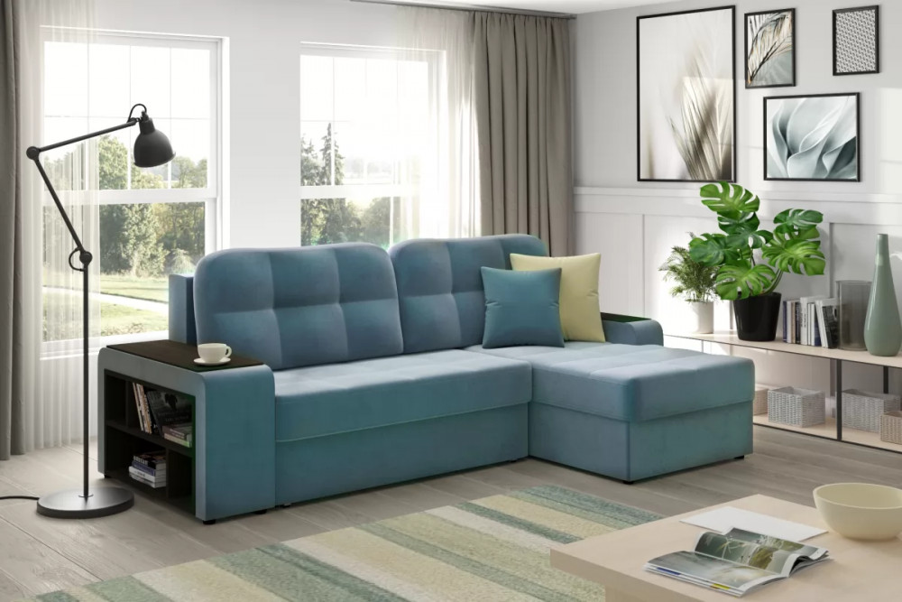 Диван-кровать угловой Дубай стильный и комфортный предмет для зоны отдыха в гостиной комнате. Модель выделяется оригинальным дизайном и качественным изготовлением. Диван Версаль имеет удобный механизм складывания "Еврокнижка". Сиденье дивана выдвигается, а спинка опускается вперед, образуя ровное место для сна. Такой диван не составит труда сложить и разложить каждый вечер и утро.Боковины оснащены декоративными накладками, которые обеспечивают дополнительную рабочую поверхность. В одну из боковин интегрирована полка для хранения книг,журналов, гаджетов.