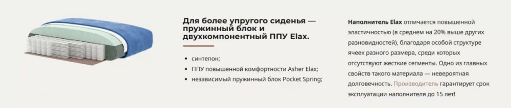 Наполнение: независимый пружинный блок Pocket Spring, синтепон, ППУ повышенной комфортности Asher Elax