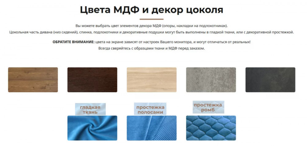 Цоколь, спинка и подлокотники могут быть выполнены в гладкой ткани, или с рельефной простежкой.