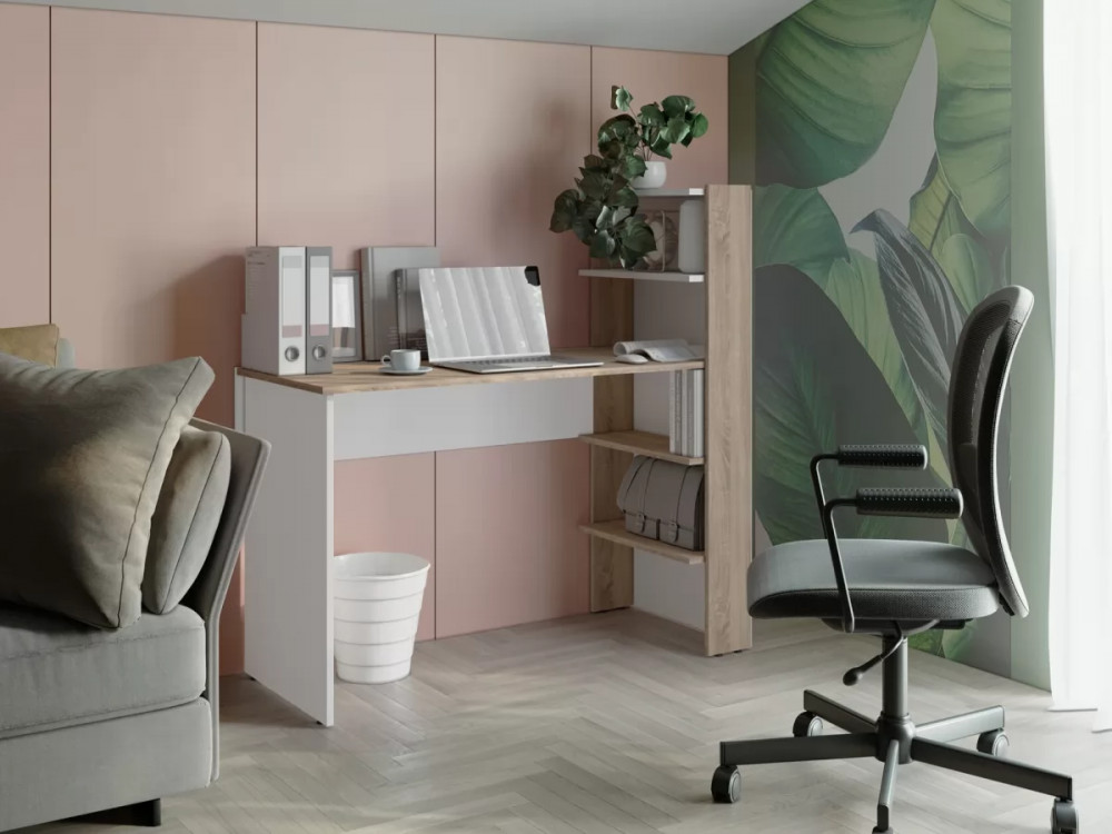 Компьютерный стол совмещает в себе удобство стола и мини стеллажа. Подходит для маленьких помещений.