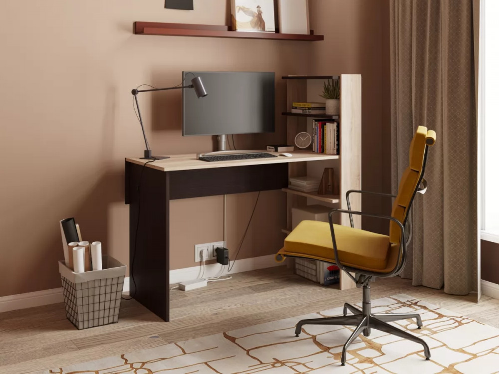 Компьютерный стол совмещает в себе удобство стола и мини стеллажа. Подходит для маленьких помещений.