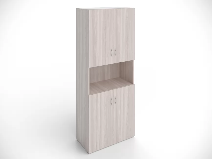 Двери открываются с помощью хромированных ручек - дуг. Шкаф стоит на ногах с регулируемыми опорами. Рабочие столы, тумбы и другую мебель из тех же материалов вы можете выбрать в коллекции для офиса Кономи.