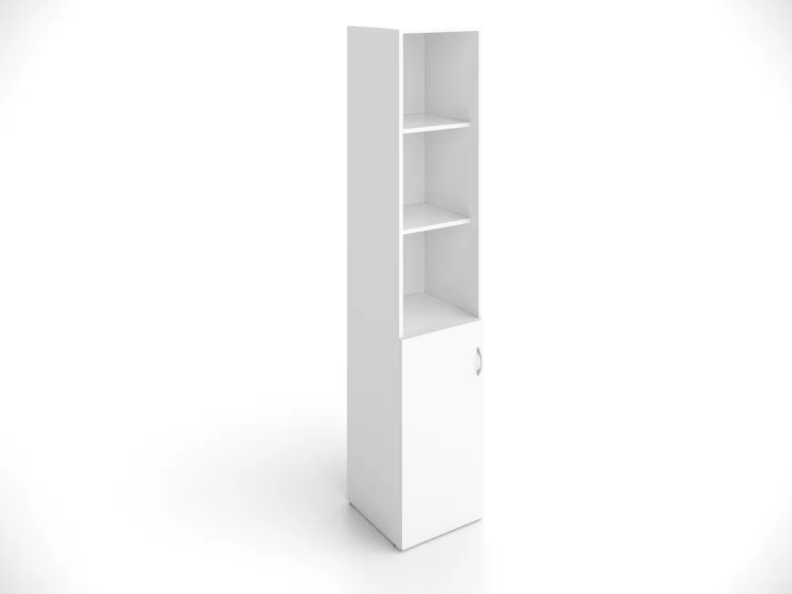 Узкий стеллаж подойдет для хранения востребованных ежедневно материалов (верхний ярус) и личных вещей (нижний ярус). Наполнением ему служат 4 полки, одна из которых прикрыта фасадом.