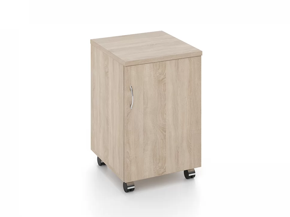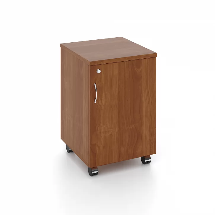 Мобильная тумба с распашной дверью и полкой добавит место хранения любому офисному столу из ассортимента коллекции Кономи. Ручка выполнена форме дуги (полированный хром). Мобильность, а значит быструю уборку обеспечивают колеса.