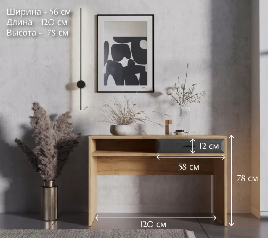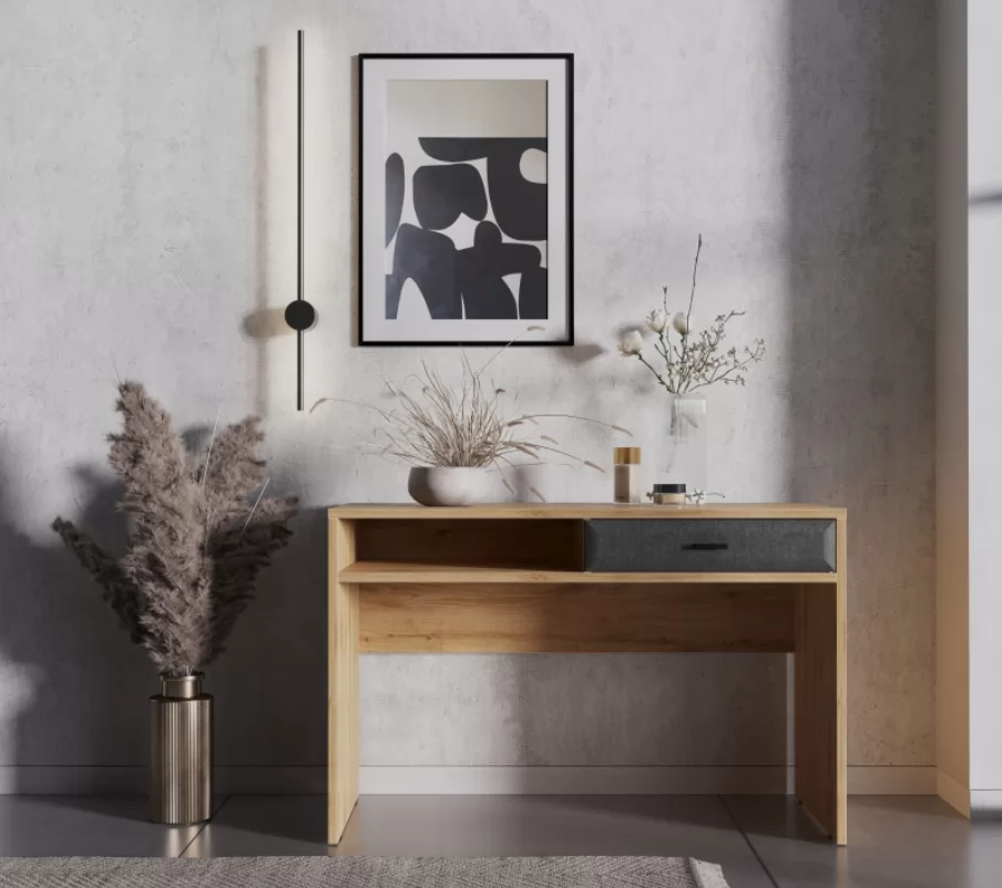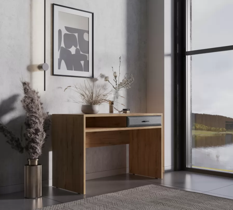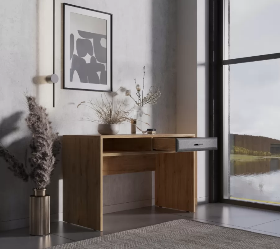Компактный и лаконичный письменный стол, станет отличным решением для небольших комнат. Просторная верхняя крышка с легкостью разместит на себе ноутбук, настольную лампу и органайзеры. Сочетание открытой полки и ящика добавляет столу индивидуальности.